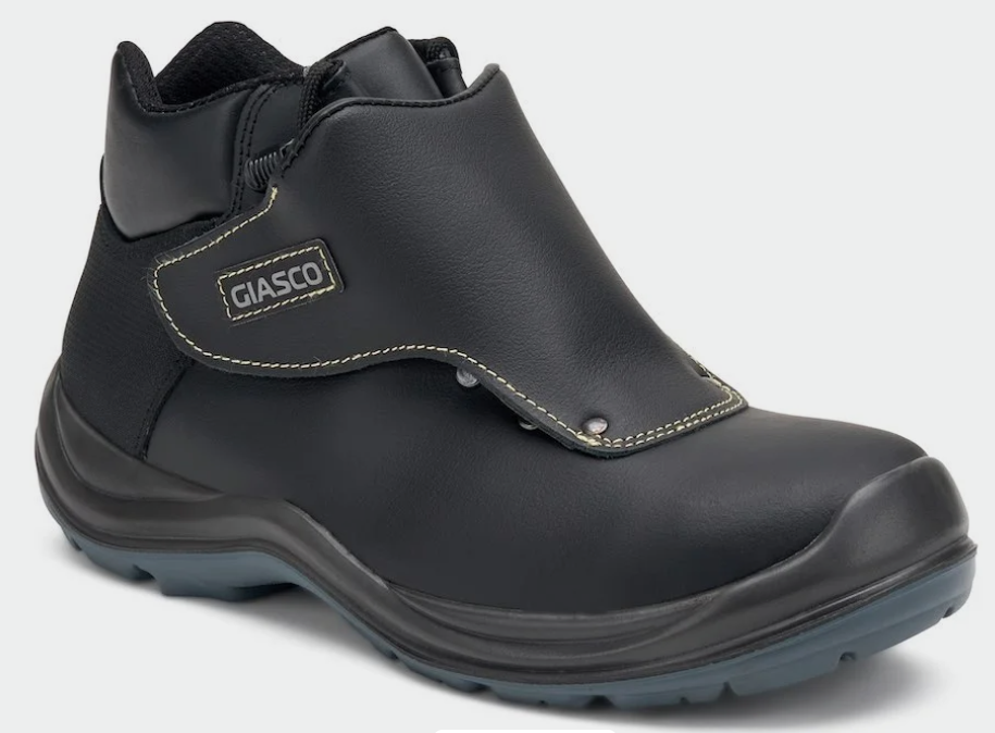 Sko med snabbanordning och lädersnören sydda med brandsäker tråd.