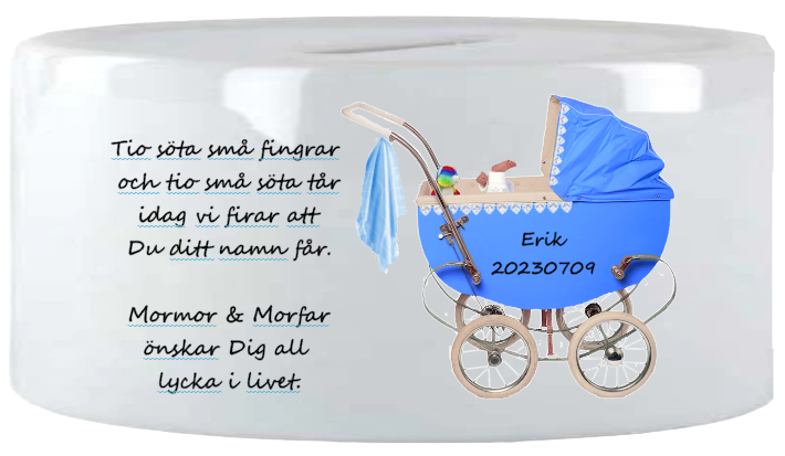 Sparbössa i keramik med egen text och foto eller clipartbild.