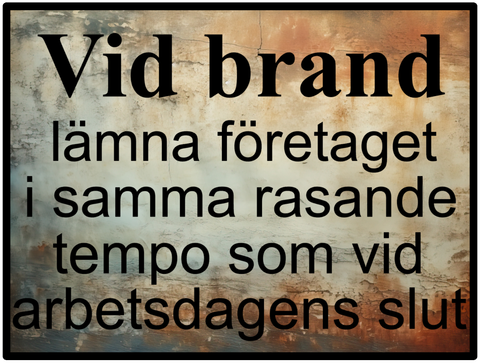 Aluminiumskylt, uppmanande brandskylt med texten Vid brand lämna företaget i samma rasande tempo som vid arbetsdagens slut .